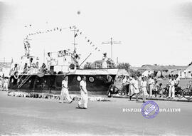 Suasana kirab / konvoi di jalanan, tampak serikat pekerja dari Pelayaran Nasional Indonesia pada Peringatan Hari buruh di Surabaya, 1 – 5 – 1953