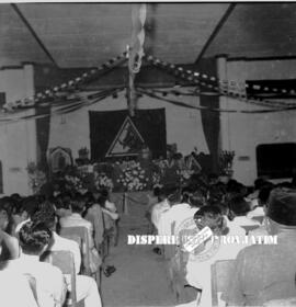 Suasana Konferensi PNI (Partai Nasional Indonesia) Jatim di Bojonegoro tampak logo / tanda gambar PNI Kepala Banteng dan disamping karangan bunga nampak sebuah logo palu arit, 26 – 3 – 1954
