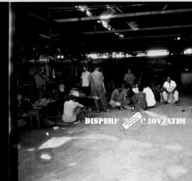 Suasana lengang pada parbik Tegel dan Beton LIGTVOET, hanya terlihat 4 orang karyawan pabrik sedang bersantai pada saat aksi aksi pemogokan (kampanye pembebasan irian barat) di Surabaya, 2 – 12 – 1957