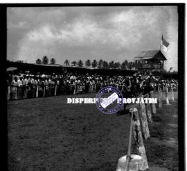 Suasana lomba pacuan (patjuan) kuda di jombang (djombang) jawa timur, masyarakat dengan antusias menyaksikan jalannya lomba, 26 – 8 – 1956