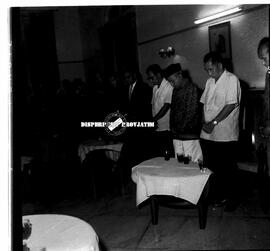 Suasana malam resepsi menyambut kedatangan regu Thomas Cup Ang Tjing Siang dan Tan Joe Hok di Surabaya, para hadirin dan undangan tertunduk memanjatkan doa, 21 – 5 – 1964