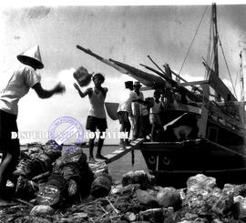 Suasana para buruh angkut sedang bongkar muat barang (kemasan ikan asin) ke dalam kapal di pelabuhan tradisional Sangkapura, Bawean Gresik, 26 – 8 – 1954