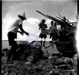 Suasana para buruh angkut sedang bongkar muat barang (kemasan ikan asin) ke dalam kapal di pelabuhan tradisional Sangkapura, Bawean Gresik, 26 – 8 – 1954