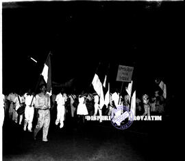 Suasana pawai peringatan HUT kemerdekaan Republik Indonesia di Surabaya yang diselenggarakan malam hari, terlihat dari kontingen Pemuda Rakyat Surabaya, 17 – 8 – 1962