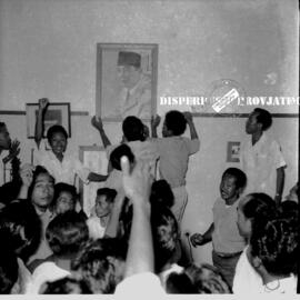Suasana penurunan foto Ratu Wilhemina dan di ganti dengan foto Presiden Sukarno di kantor Rotary Club Surabaya, tahun 1957