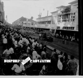 Suasana peringatan Hari Kebangkitan Nasional, terlihat rombongan pelajar melintas di Jalan Tunjungan (sekitar Hotel Oranje) di Surabaya, 20 – 5 – 1959