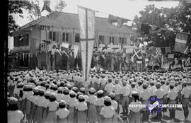 Suasana peringatan HUT Kemerdekaan RI ke 8 yang diselenggarakan di halama gedung negara grahadi yang diikuti oleh para pelajar, 17 – 8 – 1953