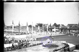 Suasana rapat raksasa menuntut pembebasan irian barat di depan kantor gubernuran Surabaya, foto diambil dari kantor gubernuran, 10 – 11 – 1957