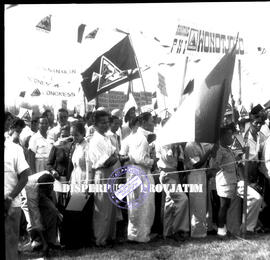 Suasana rapat raksasa, tampak terlihat peserta rapat membawa spanduk / poster-poster bertuliskan tuntutan tentang stabilitas politik di Surabaya, 30 – 1 – 1955