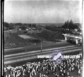 Suasana upacara peringatan hari pahlawan di Tugu Pahlawan Surabaya, defile tampak membelakngi viaduct (sekarang rel kereta selatan bank indonesia) foto diambil dari 10 – 11- 1954