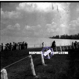 Suasanan pacuan, terlihat seekor kuda terdepan tengah berpacu di lintasan dalam lomba pacuan (patjuan) kuda di jombang (djombang) jawa timur, 26 – 8 – 1956