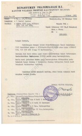 Surat dari Departemen Transmigrasi RI Kantor unit pemukiman transmigrasi PNS Jorong Asem – asem Kab. Tanah laut kepada Kantor Kabupaten Lamongan tentang permohonan keberangkatan transmigrasi an. Drs. Juardi.