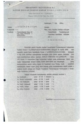Surat dari Departemen Transmigrasi RI Kanwil Propinsi Dati I Jawa Timur kepada Kanwil Departemen Transmigrasi Propinsi Sumatera Selatan di Palembang Transmigrasi guru SD an. Sdr. Ramelan Bhoedianan guru SD N Mukuh II Kecamatan Pagu Kabupaten Kediri.