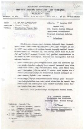 Surat dari Direktorat Jenderal Pengarahan dan Pembinaan Departemen Transmigrasi RI kepada Kepala Kantor Wilayah Departemen Transmigrasi propinsi Sumatera Selatan tentang Pengangkatan guru honor SD menjadi guru negeri an. Tukiran. BA asal Kabupaten Madiun di UPT Bingin Teluk Kabupaten Musirawas Propinsi Sumatera Selatan.