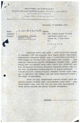 Surat dari Kepala Kantor Wilayah Departemen Transmigrasi Jawa Timur kepada Kepala Kantor Wilayah Departemen Agama RI Tk. I Jawa Timur tentang pencabutan hak sebagai warga Transmigrasi pegawai negeri guru an. Bakri Tohir guru MI Karang Pakis, Kecamatan Purwosari Kabupaten Kediri ke proyek pemukiman transmigrasi air sugihan Propinsi Sumatera Selatan.