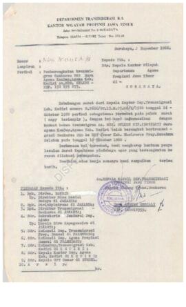Surat dari Kepala Kantor Wilayah Departemen Transmigrasi Propinsi Jawa Timur kepada Kepala Kantor Wilayah Departemen Agama Jawa Timur di Surabaya tentang pemberangkatan trans swakarsa DBB guru Agama Kandep Agama Kabupaten Kediri an. Sdr. Moh Sulkan NIP 150 195 277 dengan tujuan Propinsi Sumatera Selatan.