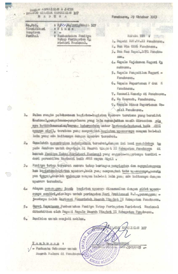Surat dari pembatu Gubernur di Pamekasan kepada Bupati KDH TK II Pamekasan tentang pembentukan panitia tetap peringatan hari-hari Nasional tgl 14 November 1983 3 lembar 56 Pertinggal, baik (3)