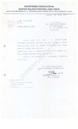 Surat Kakanwil Departemen Tenaga Kerja Propinsi Jawa Timur : Surat kepada Kepala Departemen Tenaga Kerja Kabupaten/Kodyamadya Malang tentang jawaban Tromol Pos 5000 atas dugaan pelanggaran ketenagakerjaan pada CV. Semeru Karya Malang