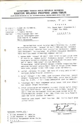 Surat Kakanwil Depnaker Jatim kepada Wakil Presiden RI Tromol Pos 5000 di Jakarta tentang laporan penyimpangan dari peraturan ketenagakerjaan oleh pabrik es Sumber Murni Bondowoso