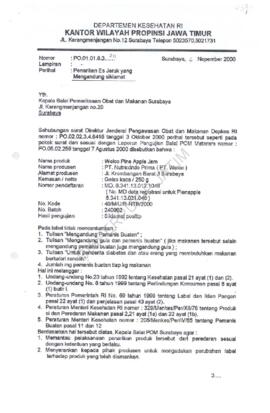 Surat kepada Balai Pemeriksaan Obat dan Makanan Surabaya Jl.Karangmenjangan No.20 Surabaya Nomor : PO.01.01.8.3.211 tentang penarikkan Es Jeruk yang mengandung siklamat, 6 Nopember 2000