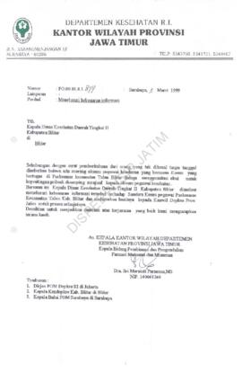 Surat kepada kepala Dinas Kesehatan Daerah Tingkat II Kab.Blitar Nomor : PO.00.01.8.1.847 tentang penelusuran kebenaran informasi, 3 Maret 1999