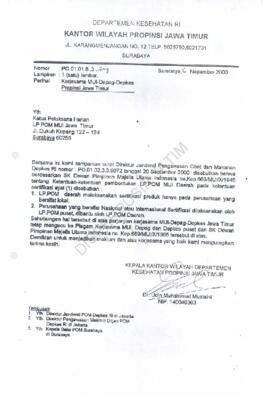 Surat kepada Kepala Kantor Departemen Kesehatan Kotamadya Surabaya Jl.Jemursari Nomor : PO.01.01.8.3.348 tentang produk minuman dengan bahan baku simplisia, 11 Pebruari 2000