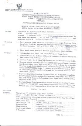 Surat Keputusan Menteri Negara Penggerak Dana Investasi / Ketua Badan Koordinasi Penanaman Modal Nomer 569/704/IID/IKTA/JATIM/203/1998 tentang pemberian izin penempatan Tenaga Asing di PT. Alumindo Light Metal Industri, Sidoarjo