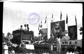 Item VI.55.0966 - Tampak tiga orang sedang berada di panggung untuk berorasi dengan latar belakang foto tokoh Karl Mark dan Lenin pada peringatan hari buruh di surabaya, 1 – 5 – 1955