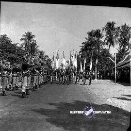 Upacara penyambutan kedatangan bendera PON VII Surabaya ketika berada di Kecamatan Mantingan, Ngawi, 6 - 8 – 1969